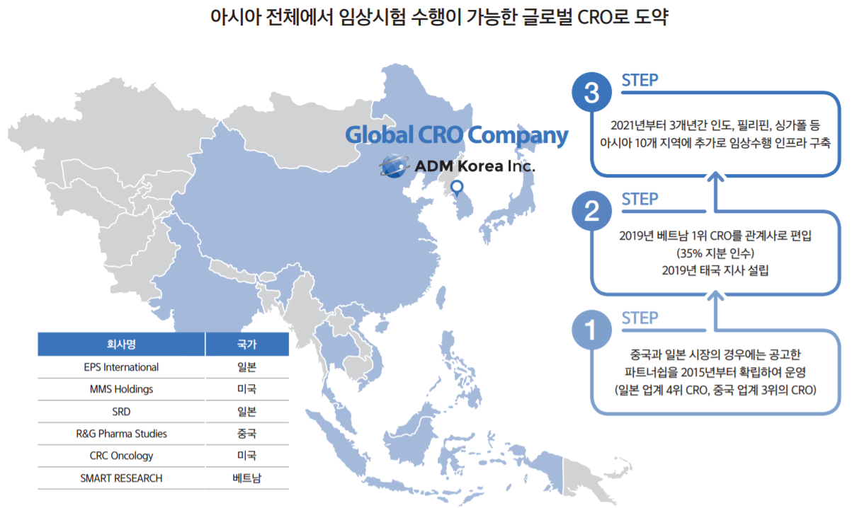 해외 시장, 특히 아시아 시장 개척을 위해 노력 중이다. 중국과 일본 CRO업체와 파트너쉽을 맺었고, 2019년에는 태국에 지사 설립, 베트남 1위 CRO 업체를 인수하였다.