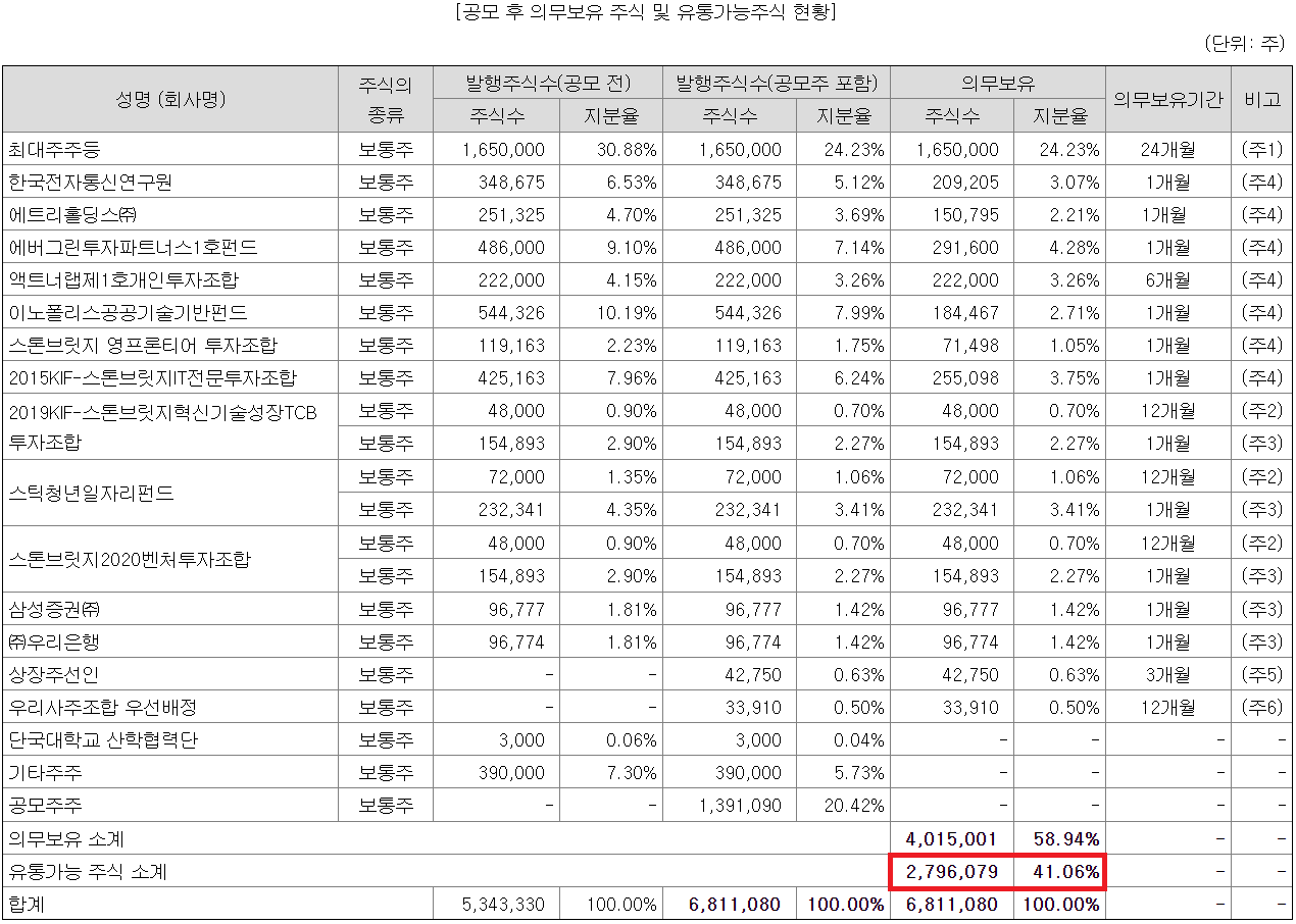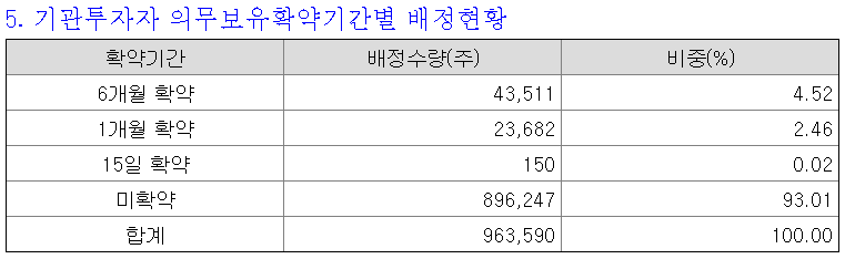 실제 기관투자자 의무보유 배정현황은 기관투자자 배정물량 96만주 중 67,343주가 의무보유확약으로 묶이게 되었다. 미확약이 93.01%로, 배정된 의무보유확약비율은 6.99%이다.