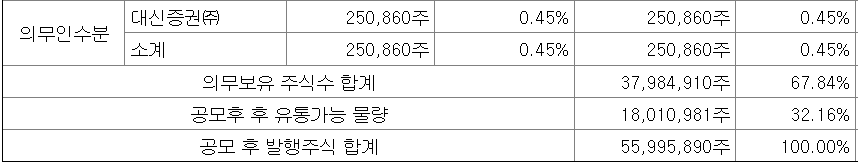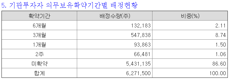 실제 기관투자자 의무보유 배정은 기관투자자 배정물량 627만주 중 840,365주가 의무보유확약으로 묶이게 되었다. 미확약이 86.6%로, 배정된 의무보유확약비율은 13.4%이다.