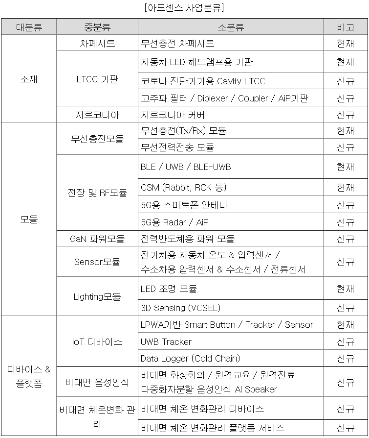 아모센스는 무선충전 차폐시트, 무선충전 안테나, 자동차 전장 모듈, Lighting 모듈 및 IoT Device 등 소재와 모듈 부문으로 구성된 소재부품 전문기업이다.