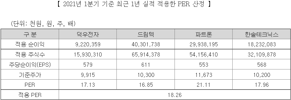 스마트폰 부품의 제조 및 판매 또는 무선충전, 반도체, 디스플레이, 자동차 전장 관련 부품 사업을 영위하는 업체들 중 재무요건을 만족하는 회사들로 선정했다. 그래도 유사기업 선정은 나름 합리적인 듯.