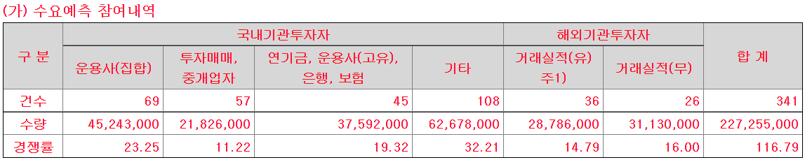 기관 수요예측 결과 최종 경쟁률 116.79를 기록하였다. 0하나 빼먹었나 의심되는 경쟁률. 에이치피오를 넘어서는 최악의 결과이다.