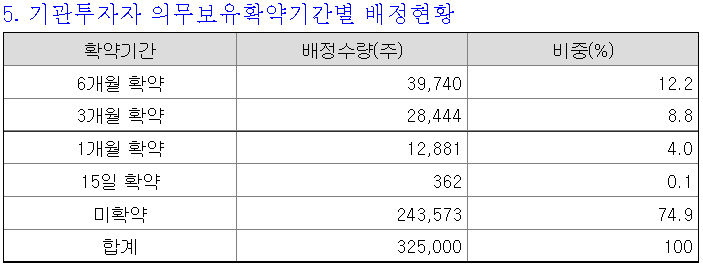 실제 기관투자자 의무보유 배정은 기관투자자 배정물량 32.5만주 중 81,427주가 의무보유확약으로 묶이게 되었다. 미확약이 74.9%로, 배정된 의무보유확약비율은 25.1%이다.