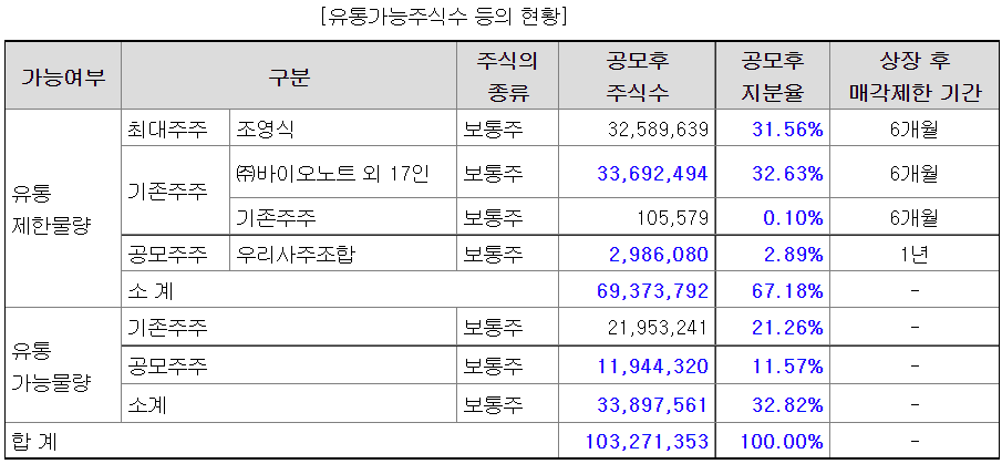 유통가능물량은 32.82%. 꽤 많은 수준이다. 공모주주의 물량보다도 기존 주주의 물량이 2배 정도 많다. 이렇게 되면 의무보유로 배정되는 물량이 확약물량보다 많아지더라도, 큰 효과는 기대하기 힘들다. 많이 줄어들어봐야 20% 후반 수준일 듯.