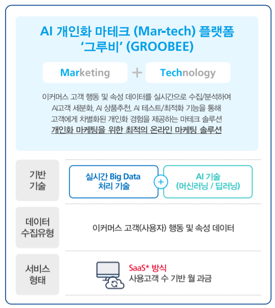 여기에 빅데이터와 AI기술을 결합한 마케팅 솔루션 그루비는 개인화 마케팅을 통해 효과적으로 고객을 유도하고, 매출을 발생시킨다고 한다.