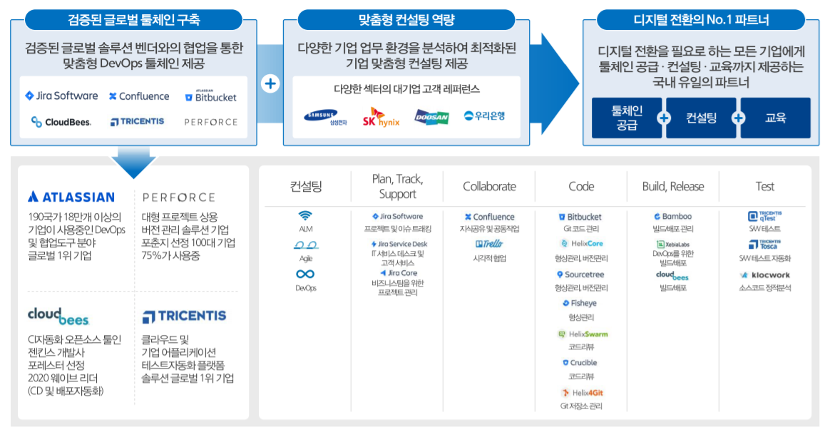 다양한 글로벌 솔루션 벤더사와 협업하여 맞춤형 툴을 제공하고, 또한 각 기업 업무 환경에 맞는 컨설팅을 제공함으로써 플랫폼 경쟁력을 확보하고 있다고 한다.