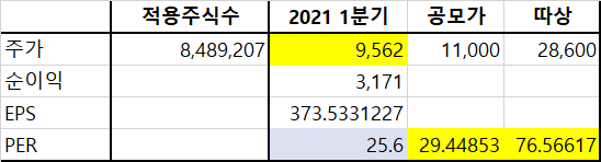 2020년 온기 실적보다는 최근 4개 분기 실적이 최근 데이터기 때문에, 최근 4개분기 실적 기준으로 계산해 보았다. 적정주가는 9,562원이다. 공모가 대비 약 13% 하락한 금액이다. 공모가 기준 PER은 29.45배, 따상 시 PER은 76.56배 정도이다.