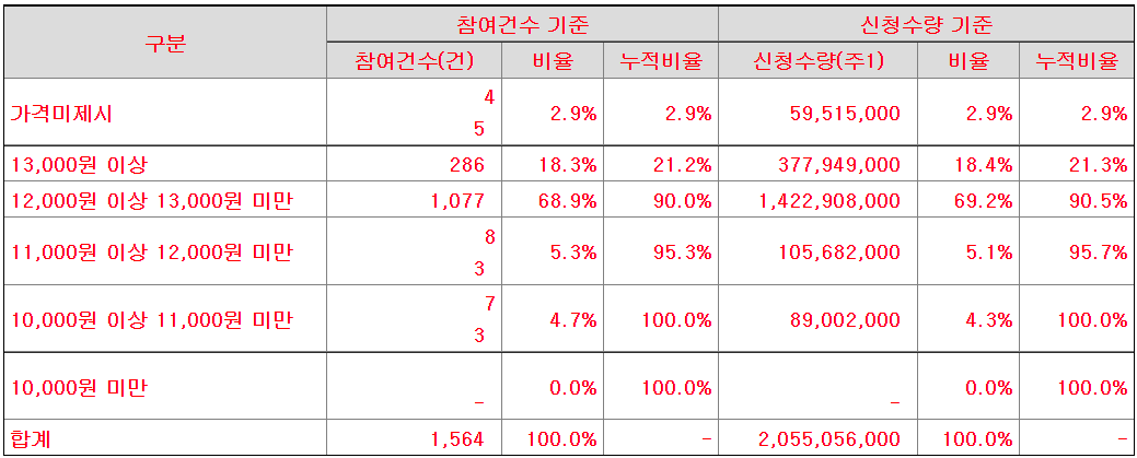 공모가 밴드 상단 미만은 단 한 개의 기관도 없었으며, 최종 결정된 11,000원 이상이 95.7%, 12,000원 이상이 90.5%에 달할 만큼 엄청난 열기였다. 솔직히 말하면 이 정도 회사인가.. 싶긴 한데..