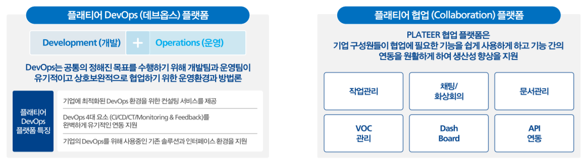 상술하였으나, 크게 두 가지 플랫폼으로 이루어져 있다. 개발과 운영을 상호보완적으로 운영할 수 있는 DevOps 플랫폼과, 구성원들의 협업을 다양한 방식으로 도와주는 협업 플랫폼이다.