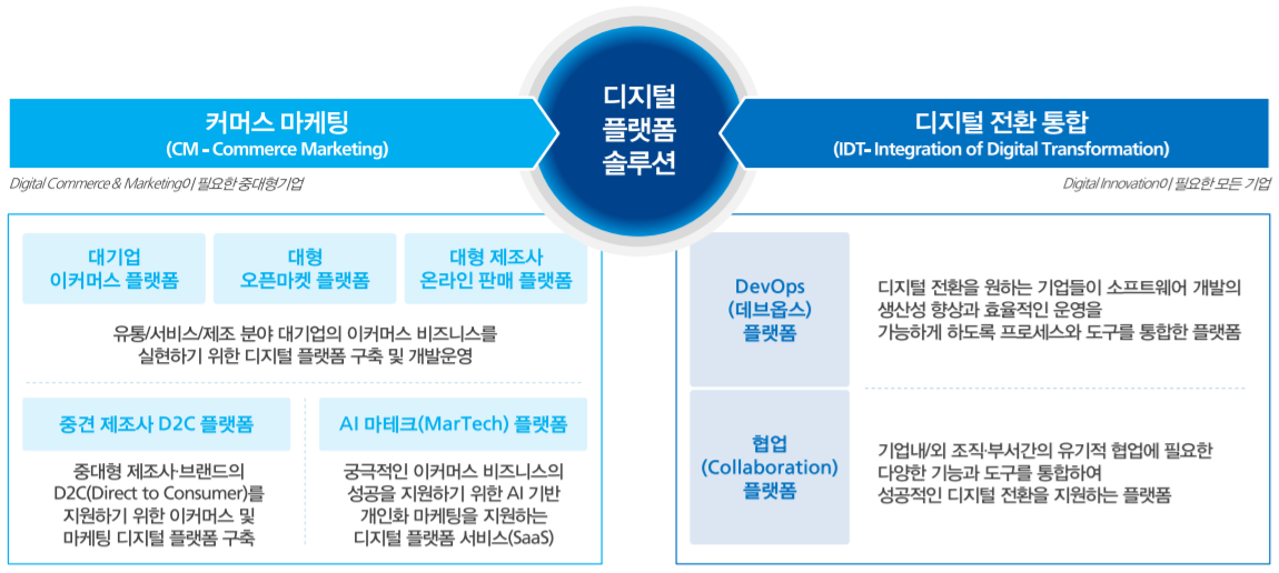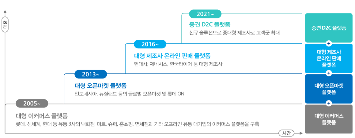 2005년부터 대형 이커머스 플랫폼을 시작으로, 오픈마켓, 제조사 온라인 몰 등 시대의 변화에 맞게 커머스 플랫폼을 구축해 왔다. 최근에는 솔직히 웬만한 대형회사들은 이커머스 생태계를 다 구축한 상태이므로, 중견 제조사로 고객군을 확대하고 있는 듯하다.