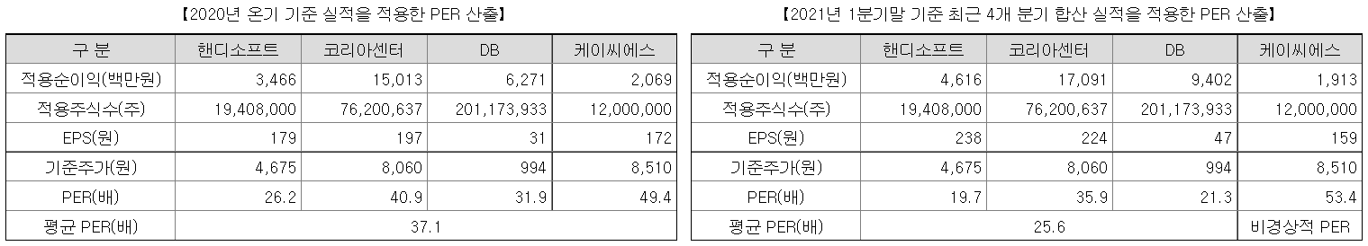 선정 결과만 봐도 딱 느낌이 오지 않나? 2020년 온기 실적과 2021년 1분기를 포함한 최근 4분기를 섞어 썼다. 그 과정에서 최근 4분기 기준으로는 케이씨에스가 경상적 PER 요건(50배)을 넘어서서 제외했다고 한다.