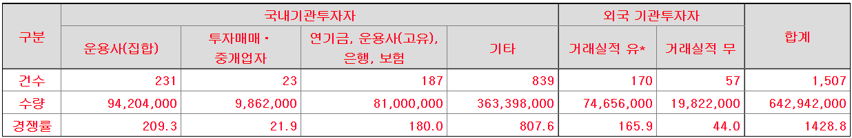 특이한 건, 기관 투자자 배정 물량을 미리 공지했다. 의무보유 확약비율은 8.93%였으나, 실제 배정된 주식 물량은 42.3%다. 신청 비율에 비해 실제 배정이 굉장히 많이 된 편.