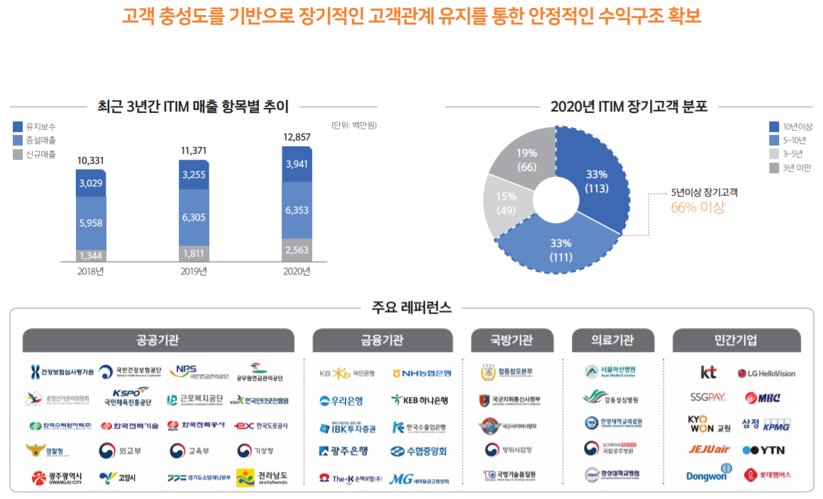 주요 공공기관 및 금융기관 등을 고객으로 두고 있다. 기업 유형을 보면 알겠지만, 도입 후에 웬만하면 솔루션을 잘 교체하지 않을 것? 같은 기업들이고, 실제로 장기고객이 많다.