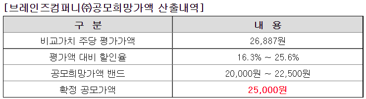 주당 평가가액에 공모가 상단 대비 16.3%의 할인율을 적용해 공모가 밴드를 산출했다. 공모가가 상단 대비 2,500원 상향한 25,000원으로 확정되면서 할인율은 7.55%로 결정되었다.