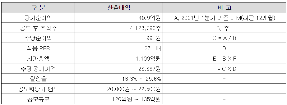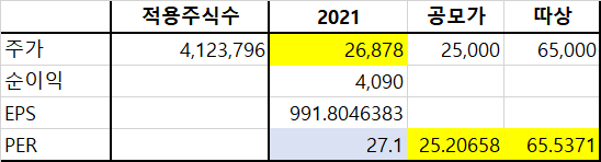 딱히 공모가 산정 과정에서 문제점은 발견하지 못했다. 공모가 기준 PER은 25.2배, 따상 시 PER은 65.5배 정도이다.