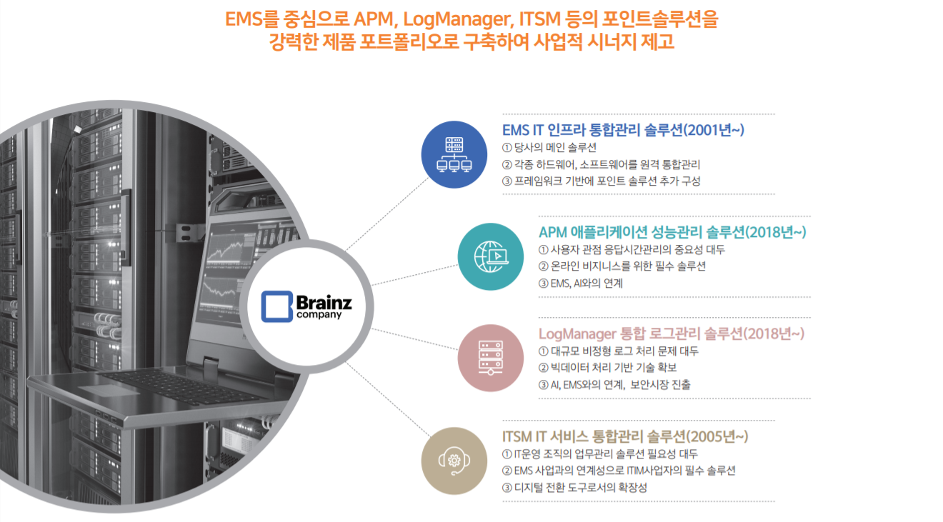 다양한 IT인프라를 통합 관리할 수 있는 EMS를 비롯하여 APM, 로그매니저, ITSM등 전사적인 자원관리 솔루션을 주력 제품군으로 보유 중이다.