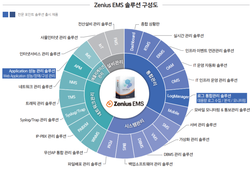 대표 제품은 Zenius EMS다. Zenius EMS는 다양한 포인트 솔루션을 제공하여 고객은 단일 제품만으로 모든 IT 인프라를 관리할 수 있다.
