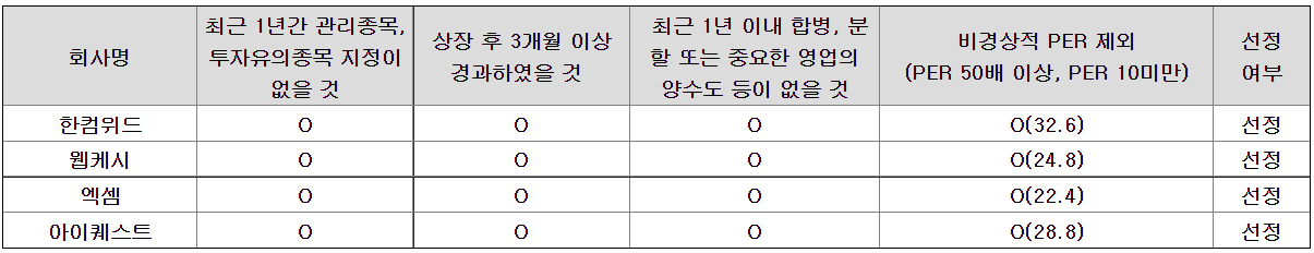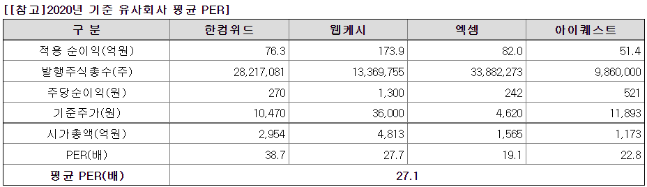 유사기업으로 한컴위드, 웹케시, 엑셈, 아이퀘스트를 선정하였다.