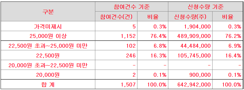 밴드 상단인 25,000원 이상 제시한 기관이 76.2%다. 다만 25,000원 미만으로 제시한 기관도 23.5%나 된다.