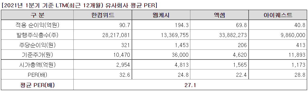 2021년 1분기 기준 당기순이익에 유사회사 평균 PER 27.1배를 사용하여 계산한 주당 평가가액은 26,887원이다.