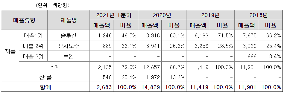 솔루션별 매출현황은 아니고, 매출 유형별로 분류하였다. 솔루션 매출이 제일 높은 편이고, 유지보수 매출이 그 다음이다. 유지보수 매출은 솔루션 매출 이후 꾸준하게 발생하고, 기업에서 한번 도입한 인프라 관리 시스템은 쉽게 바꾸기 어렵기 때문에 나름 안정적인 매출이 가능하다고 본다.